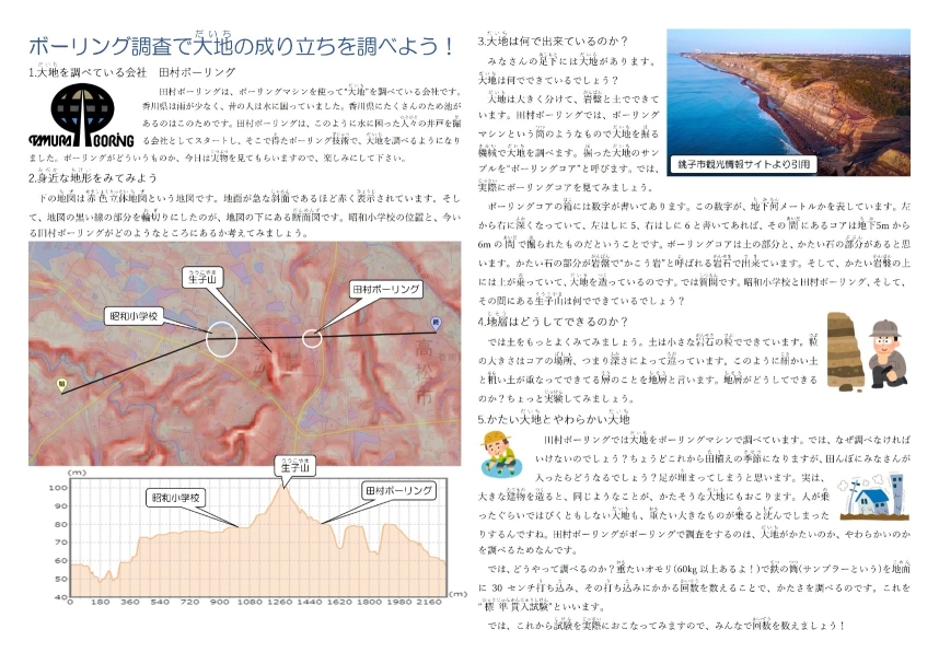 まずは身近な小学校がどのような地形・地質条件のところにあるのか?そして、昭和小学校の皆さんが馴染み深い、生子山(ううこやま)がどんな地質で成り立っているのか?ボーリングコアや簡単な実験を通じて考えてもらいました。