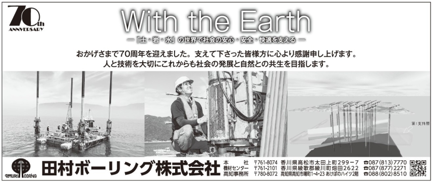 このたび、田村ボーリングは創業70周年を記念して、建設業界専門紙「建通新聞」の四国4県版(香川・徳島・愛媛・高知)10月28日付に広告を掲載いたしました。