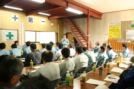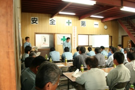 今大会は、当社の畑田機材センターに於いて下記のプログラムのもと協力会社からも多数の参加を頂き、より充実したものとなりました。大会では、前年度の安全衛生諸活動についての評価・他が行われ、今年度の基本方針・目標を共有すると共に、今年度の安全衛生管理計画書の周知等が行われました。そして、締めくくりとして、社員代表による力強い安全宣言、ならびに参加者全員による安全スローガンの唱和をもって閉会しました。