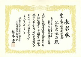 「平成26-27年度五台山地区地質調査業務」が優良業務として、主任技術者の谷野宮竜浩が優秀建設技術者(業務)として表彰されました。
