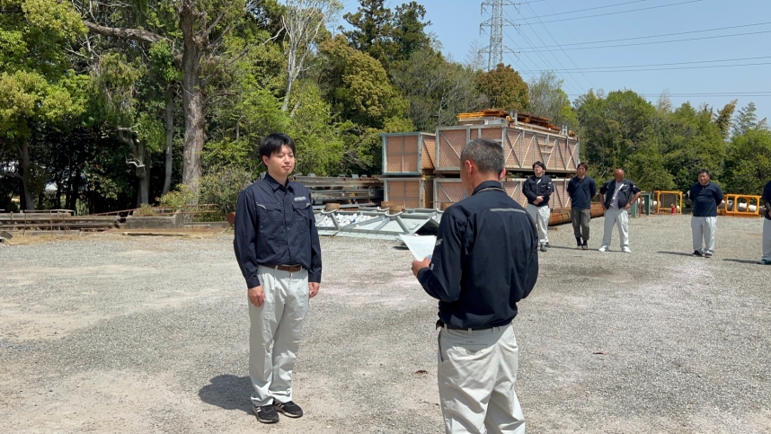 「特に近年の気温上昇に伴う熱中症の問題は深刻です。今年度は、ウェアラブルデバイスの活用や、互いの気配りによる体調不良の早期発見等により熱中症を未然に防ぐと共に、バディとの信頼関係をより深め、『労災事故ゼロ』を目指します」と原社員は宣言しました。