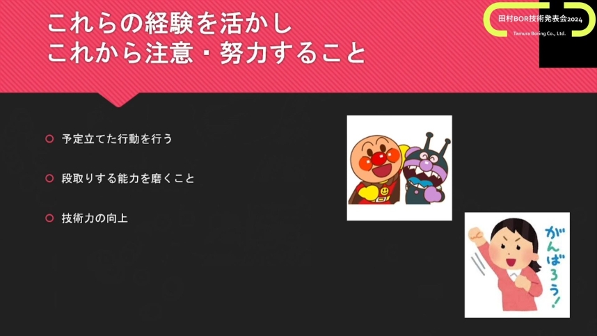 技術力だけでなく、人間性を磨くことの重要性を説く発表もありました。相手の立場に立って考えることや、感謝の気持ちを持つことなど、社会人としての基本姿勢が語られました。