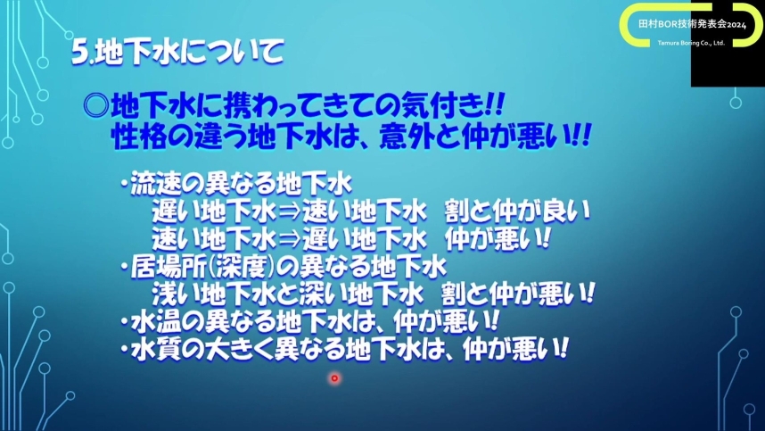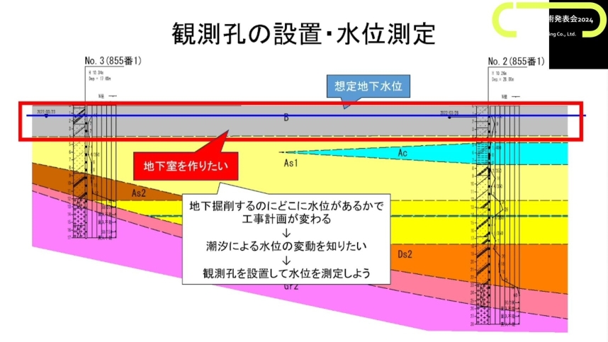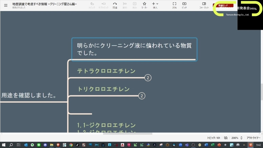 土壌汚染調査や油漏れ事故の対応など、環境保全に関する発表が複数ありました。迅速かつ適切な対応ができる技術力の重要性が強調されていました。