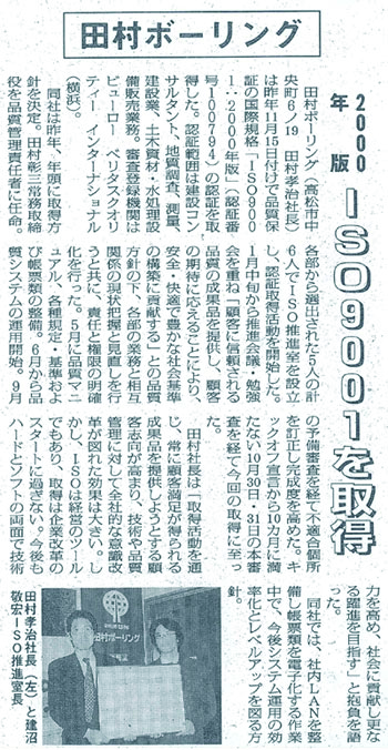 品質マネジメントシステムISO-9001(2000年版)の認証を取得しました。 2001年11月28日(水) 審査機関 / ビューロ ベリタス クオリティー インターナショナル社 認定機関 / UKAS 認証範囲 / 建設コンサルタント(地質部門・道路部門)、地質調査業、測量業、建設業(許可業種 / 土木工事、とび・土工・コンクリート工事、さく井工事、管工事)、土木資材・水処理設備販売 承認番号 / NO.100794